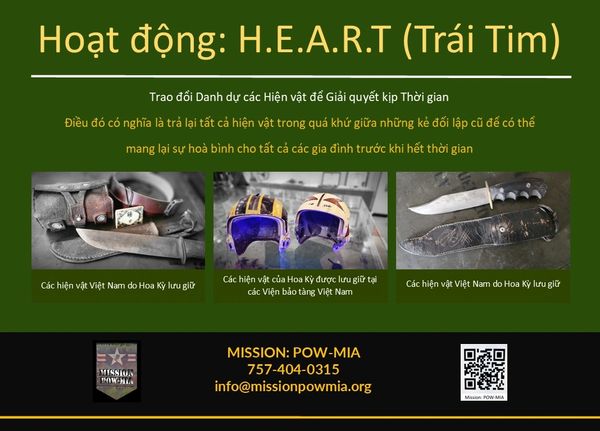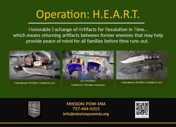 - Exchanging wartime artifacts with Vietnamese museums and individuals, to return American MIA artifacts to families, and Vietnamese materials to Vietnam (through Operation: H.E.A.R.T.)